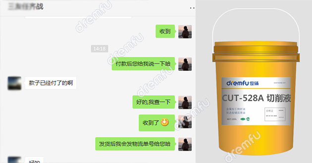 该客户生产人员当天就下了5大桶给采购,隔一天采购人员就把紫铜切削液定单下给了王小姐。同时这家客户付款率也很及时,不到上午12点款项就到位。俊辅润滑油马上就安排工厂这边生产,下午五点左右准时物流出。